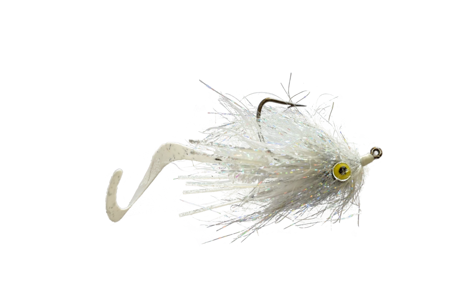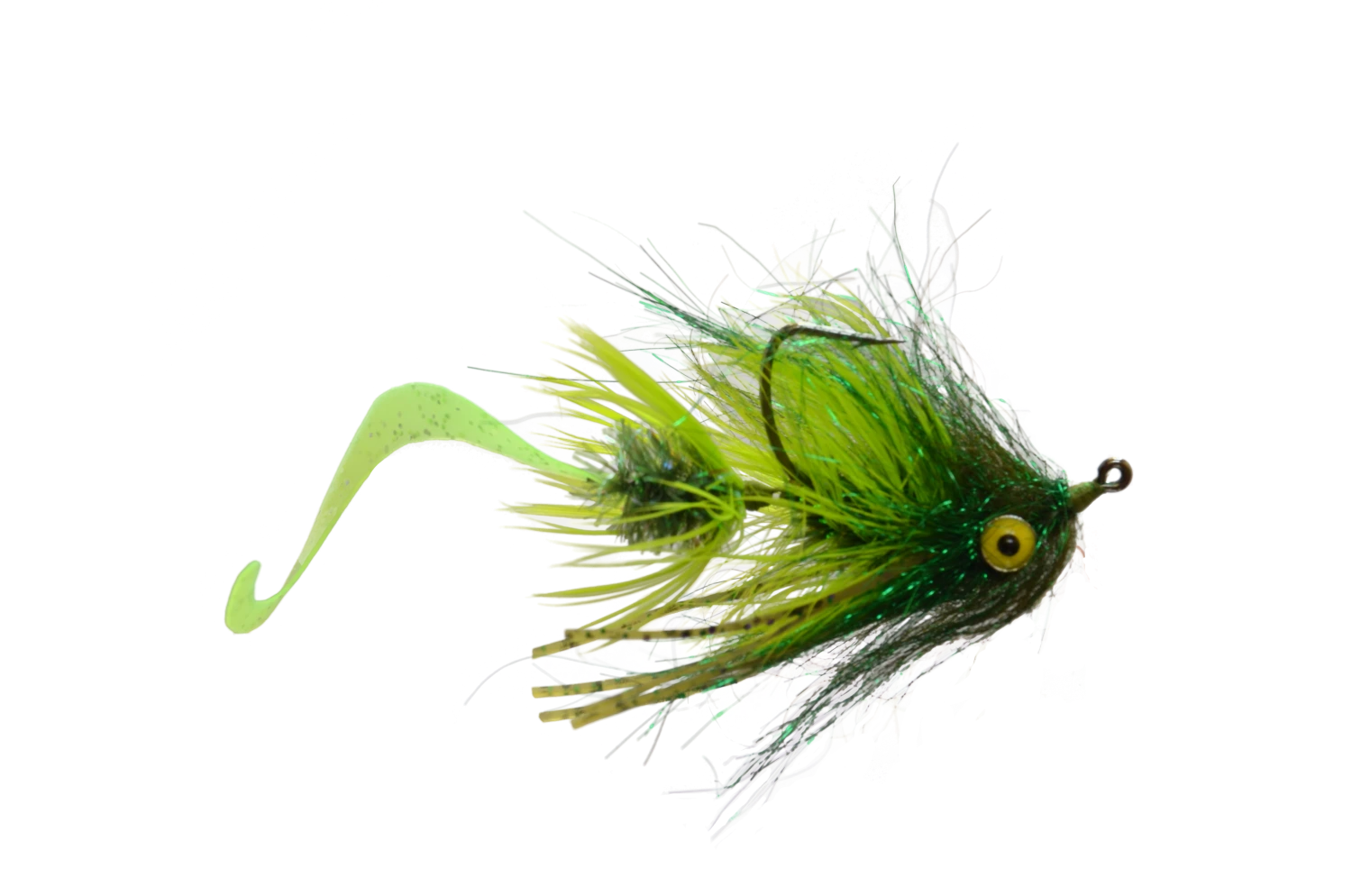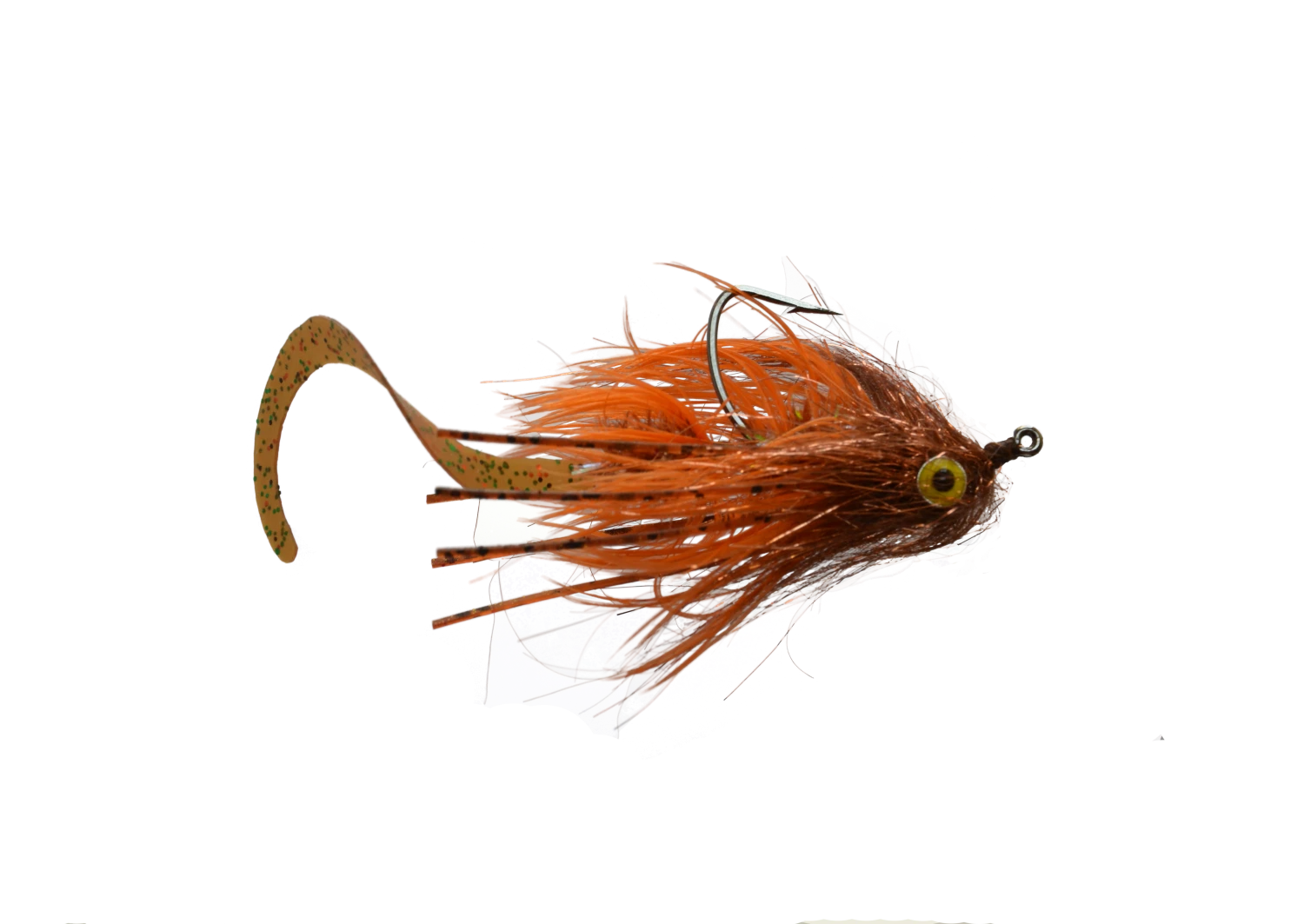 The Devil Dog is a great attractor fly pattern. Great for bass, trout, and even carp! It is tied with a barbell that will ensure the fly swims with the hook point up to avoid most snags in the water. The Body has a combination of hackle, metallic flash, and sili legs to give a lot of movement and attraction to this fly. And if that was not enough, there is a separate shank tied out the rear with a silicone fly tail attached. Not only will the fly tail pulsate in the water going back behind the fly, but with it being tied on a shank it can rotate 180 degrees in any direction giving the fly tail even more action. Changing direction on this fly can make it seem more alive than having a simple fly tail alone. It comes in 4 colors: black, white, orange, and chartreuse. The white and chartreuse are great general attractors while the orange is a great crayfish imitation and the black is a good imitation of a leech.
