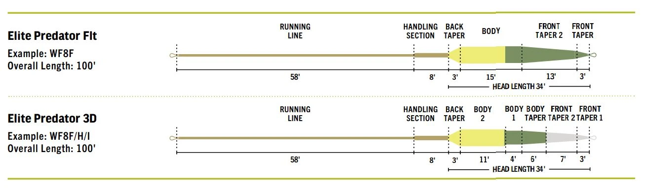 Whether fishing for trout, bass, pike, or musky there are times when a large fly is the best option, and RIO’s Predator line series is designed specifically to cast them easily. Featuring a short, powerful front taper and plenty of weight at the front, the lines have no problem casting the biggest of flies with ease. Whether floating or sink tip, each line is built on RIO’s low stretch ConnectCore Plus for maximum performance, and features SlickCast—the slickest, most durable coating on the market. RIO’s unique design of these lines results in head lengths getting shorter as the line size increases. This results in more grains per foot (more power) as the line size increases.